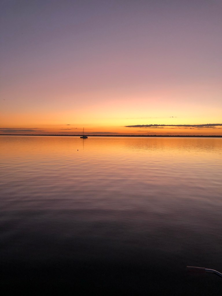 For dinner I cooked chicken and dumplings with rice. Tom really liked it. We saw a beautiful sunset. The water is so calm, it almost looks like glass. Overall it was a really good day. It feels good to be back on track. Tomorrow we are headed towards Belhaven, North Carolina. We plan to anchor at the Tuckahoe Point Anchorage.