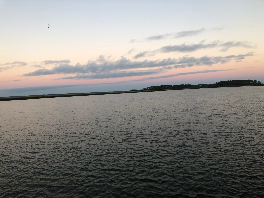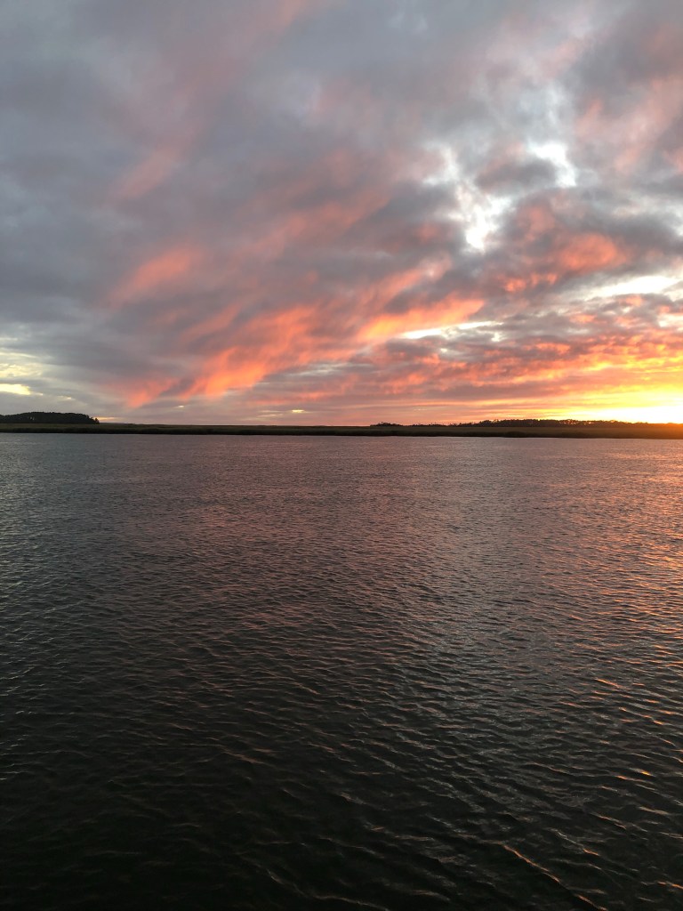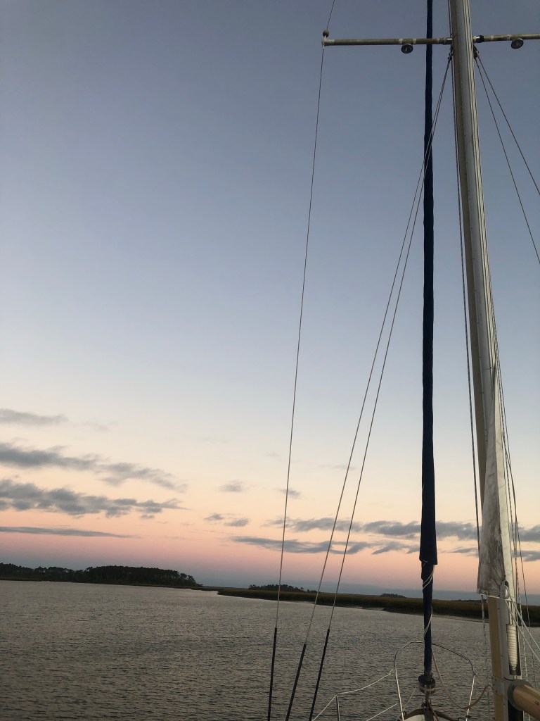 Woke up this morning to a stunning sunrise. Tom pulled the anchor up and we took off. Well, about 300 yards from the anchorage the steering stopped working, while I was at the helm. It was a pretty scary feeling and I almost ran us into the marsh. I quickly threw it in reverse and Tom went and dropped the anchor again.