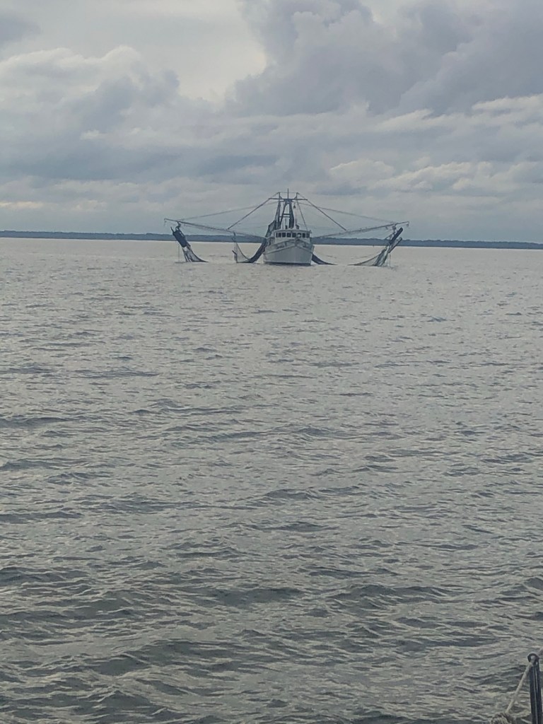 We crossed the Sapelo sound. It was a little choppy as we were passing through the inlet. There was a big shrimp boat catching delicious shrimps as we passed by. Their big outriggers were out and I think they look cool.